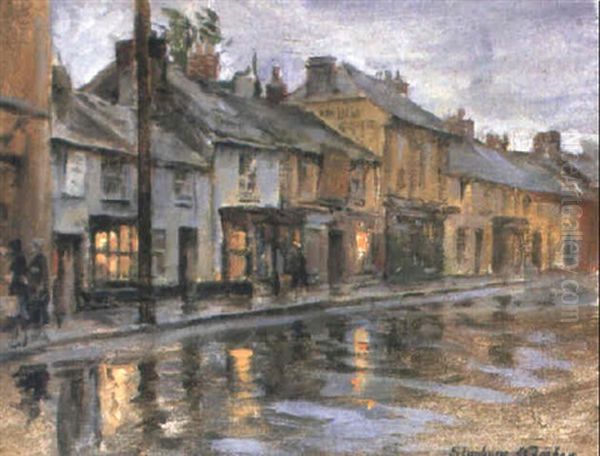Stanhope Alexander Forbes' Rainy Evening (circa 1912) captures the muted poetry of urban life in early 20th-century Britain. Through impressionistic brushstrokes and a subdued palette of greys, blues, and warm gaslit yellows, Forbes transforms an ordinary rainy street scene into an evocative visual symphony. The wet cobblestones reflect flickering lights while shadowy figures hurry under umbrellas, exemplifying the artist's mastery of "Newlyn School" realism blended with atmospheric tonalism. As a key figure of British post-impressionism, Forbes elevates this genre scene beyond documentation – the painting hums with human presence despite anonymity, achieving what critic Frank Rutter praised as "emotional realism." Historically significant as part of Britain's transition from Victorian narrative painting to modern everyday poetry, this work demonstrates how provincial artists reinterpreted French plein-air techniques through distinctly British sensibilities.
