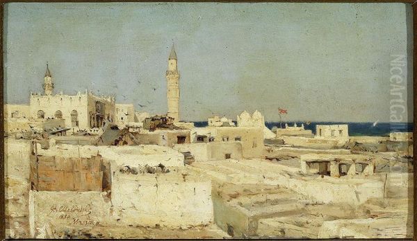 Stanislaw Chlebowski's View of Massawa is a captivating Orientalist masterpiece that transports viewers to the sun-drenched shores of the Red Sea. Painted in the late 19th century, the work showcases Chlebowski’s meticulous attention to architectural detail and his fascination with Middle Eastern landscapes. The scene depicts Massawa's bustling port, bathed in warm, golden light, with Ottoman-style buildings and palm trees framing the composition. Chlebowski, a Polish painter who served as the court artist for Sultan Abdulaziz, masterfully blends realism with Romanticism, infusing the exotic locale with a sense of quiet grandeur. This painting is a significant example of European Orientalism, reflecting the 19th-century Western intrigue with the "mystical East" while also documenting historical architecture now lost to time. Its precise draughtsmanship and luminous color palette make it a notable piece in Chlebowski’s oeuvre and Orientalist art history.