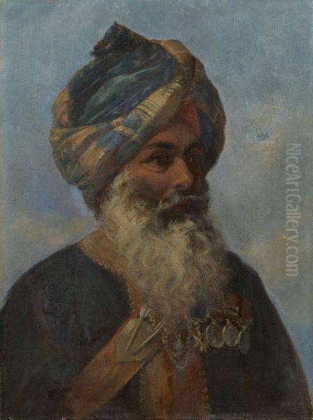 The portrait Risaldar Anoop Singh, Sirdar Bahadur, 11th Bengal Lancers by Sydney Prior Hall captures the dignified presence of a distinguished Indian cavalry officer during the British Raj. Painted in the late 19th century, Hall’s work exemplifies colonial-era portraiture, blending Victorian realism with subtle ethnographic detail. The subject’s ornate uniform, richly adorned with medals and a turban, radiates authority, while his calm yet piercing gaze conveys both pride and solemnity. Hall, renowned for his illustrations in The Graphic and as a war artist, rendered this piece with meticulous attention to texture and light, elevating it beyond mere documentation to a striking character study. Historically, such portraits served as cultural artifacts, reflecting the complex dynamics of imperial service and identity. Today, the painting stands as a testament to Hall’s skill in capturing the nuances of his subjects and remains significant for its intersection of military history and colonial art.