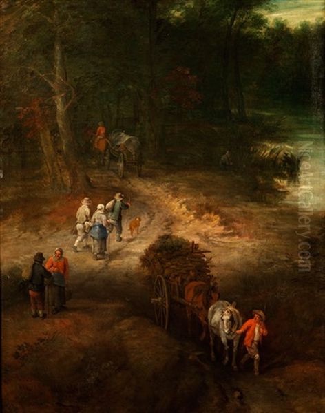 Waldrand Am Flusslauf Mit Mehreren Bauersleuten Auf Einem Waldweg