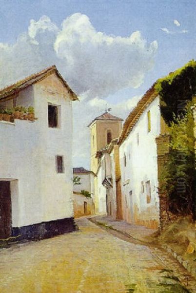 Gazing at Theodor Esbern Philipsen’s "Gadeparti Fra Granada," one is immediately transported to the sun-drenched landscapes of southern Spain, where warm earth tones and dappled sunlight create a vivid, almost tactile sense of place. Painted in 1887 during Philipsen’s travels, this work exemplifies the naturalistic yet poetic approach of the Danish Realist movement, blending meticulous observation with a luminous, broken brushwork technique that anticipates Impressionism. As a pivotal figure bridging realism and modernism in Scandinavia, Philipsen captured Granada’s rustic charm not as an exotic postcard but as a lived-in, breathing world. The painting’s historical significance lies in its role in introducing plein air practices to Nordic art, while its earthy palette and dynamic composition reveal Philipsen’s admiration for Spanish masters like Velázquez. Today, it stands as a testament to the quiet revolution of light and authenticity in late 19th-century European art.