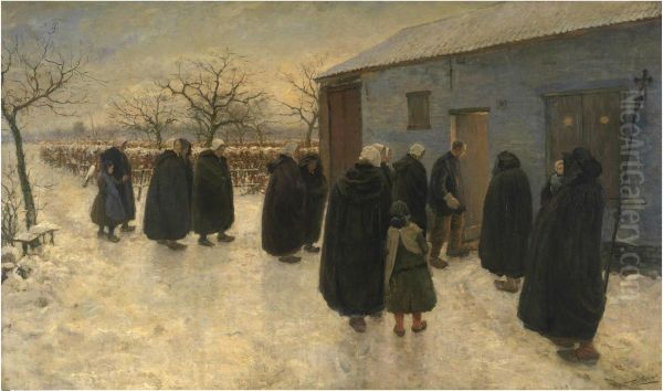 Theodore Verstraete’s To the Vigil is a poignant evocation of rural life in late 19th-century Belgium, capturing an intimate moment steeped in quiet solemnity. The painting’s muted palette and soft, diffused light create a mood of serene contemplation, characteristic of Verstraete’s realist-impressionist style. Known for his sympathetic portrayal of peasant life, Verstraete infuses the scene with warmth and dignity, balancing detailed figuration with loose, atmospheric brushwork. Historically, the work aligns with the Social Realist movement, reflecting the growing artistic focus on everyday humanity amid industrialization. Though less celebrated than his contemporaries like Constantin Meunier, Verstraete’s contributions to genre painting offer a tender, unidealized glimpse into his era, making To the Vigil a quietly significant piece in European art history.
