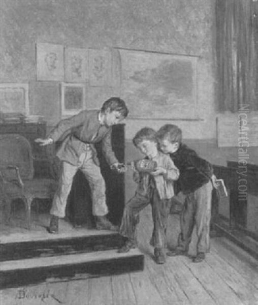 Les Ecoliers Malicieux by Théophile Emmanuel Duverger (1821-1898) is a charming genre painting that captures the playful mischief of schoolchildren in mid-19th century France. Executed in Duverger's signature Academic-Realist style, the work radiates warm nostalgia through its meticulous attention to textile details and animated facial expressions. Set against a rustic classroom backdrop, the scene depicts children sneaking glances or whispering secrets, their innocent rebellion immortalized by delicate brushwork that softens the academic precision. As a prominent figure of French genre painting, Duverger contributed significantly to preserving everyday bourgeois life during France's post-revolutionary period, with this particular piece exemplifying his ability to elevate commonplace moments into poetic vignettes. The painting's sentimental yet technically accomplished approach places it at the intersection of Romanticism's emotionality and Realism's observational rigor.
