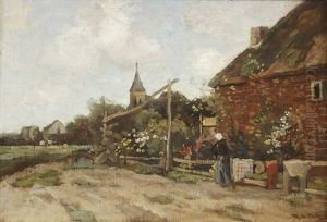 For interior styling, this artwork lends warmth to traditional or rustic-chic spaces. In a study or lounge, pair it with dark wood furniture and textured linens to enhance its earthy palette. The medium scale (typical of de Bock’s village scenes) suits above a console or as part of a salon-style wall arrangement. Soft lighting—like a brass task lamp—would echo its golden hues, while terracotta accents or a muted green armchair could harmonize with its natural tones. In minimal settings, let it anchor the space as a focal point, balancing softer walls with its rich chiaroscuro. For offices, it adds subtle sophistication; place it near leather-bound books or a weathered desk to underscore timeless elegance. Frame it in an ornate gilt or simple oak frame to match your aesthetic—either choice honors its Hague School lineage.