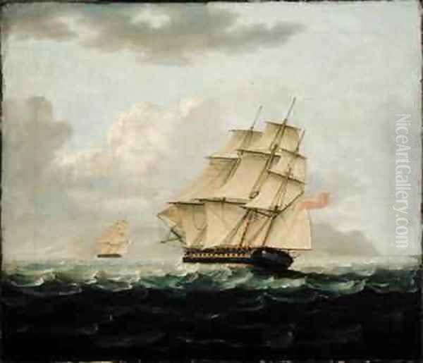 The painting A British Frigate in Pursuit of a French Frigate by Thomas Buttersworth captures the dramatic tension of naval warfare during the Napoleonic Wars. Known for his maritime realism, Buttersworth masterfully depicts the surging waves, billowing sails, and dynamic interplay of light and shadow—imbuing the scene with urgency as the British vessel gains on its French counterpart. The work exemplifies the Romantic period’s fascination with heroic struggle and the sublime power of nature, rendered through precise detailing characteristic of British maritime art. Buttersworth, a former Royal Navy sailor, brought firsthand authenticity to his compositions, making this piece not just visually striking but historically significant. It stands as a prime example of early 19th-century naval paintings, bridging documentary accuracy and artistic grandeur, and remains sought-after by collectors for its vivid storytelling and technical mastery.