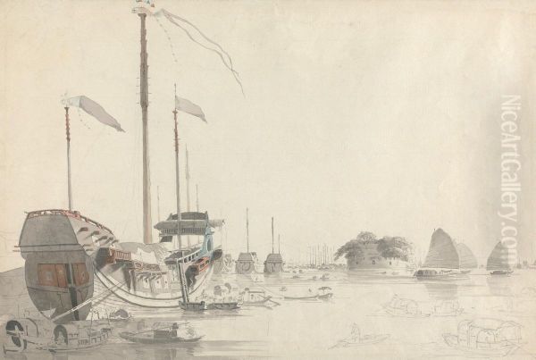 The painting Boats near a Dutch Folly Fort, Canton by Thomas Daniell (1749–1840) captures a serene yet historically rich scene from late 18th-century Canton (modern-day Guangzhou), blending documentary precision with romantic charm. Known for his detailed topographical works of Asia, Daniell presents a tranquil waterfront dotted with traditional Chinese boats, framed by the Dutch Folly Fort—a colonial relic that speaks to Europe’s mercantile ambitions in China. The composition balances delicate brushwork with atmospheric perspective, a hallmark of British landscape painting during the Romantic era. This piece stands as a bridge between ethnographic record and artistic imagination, reflecting the Western fascination with "exotic" locales during the Age of Exploration. Its historical value lies in documenting Sino-European trade dynamics, while its soft light and harmonious tones place it within the picturesque tradition alongside artists like William Hodges.