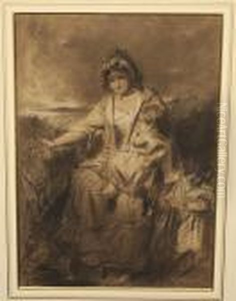 Study Of A Mother And Children, A Coastal Scene In The Distance