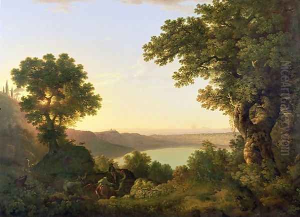 Thomas Jones’ Lake Albano (1782) captures the serene beauty of the Italian countryside with remarkable intimacy. Painted during Jones’ time in Italy, this small-scale oil sketch exemplifies his pioneering approach to plein air painting—an innovative practice for its time, predating the Impressionists by nearly a century. The composition bathes in soft, golden light, with the tranquil lake mirroring the sky and rugged hills framing the scene in earthy tones. Unlike the grandiose neoclassical works of his contemporaries, Jones’ focus on fleeting atmospheric effects and unidealized landscapes marks him as a precursor to naturalism. Though lesser-known in his lifetime, this work is now celebrated for its loose brushwork and candid warmth, offering a bridge between traditional landscape painting and modern sensibilities. Today, it holds a quiet yet significant place in art history as a testament to the quiet revolution in observing nature firsthand.