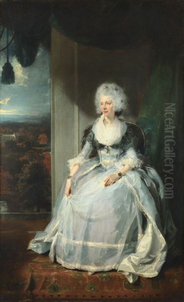The Portrait of Queen Charlotte by Sir Thomas Lawrence captures the dignified elegance of Britain’s longest-serving queen consort with remarkable sensitivity. Painted circa 1789-1790, Lawrence—then a rising star in portraiture—renders the queen in soft yet luminous brushwork, her expression poised between regal reserve and quiet warmth. Dressed in sumptuous silk with delicate lace, she holds a book, subtly emphasizing her renowned intellectual interests. The rich crimson drapery and gold detailing frame her figure with Baroque-inspired grandeur, while the artist’s fluid, almost Romantic handling of light lends a modern vitality. This work stands as a bridge between 18th-century formal portraiture and the more expressive styles of the Romantic era, cementing Lawrence’s reputation as a master of capturing personality within grandeur.