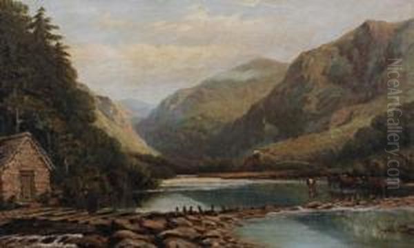 Welsh River Landscape With Cattle Watering And A Woman On A Footbridge by Thomas Butler of Pall Mall captures the serene tranquility of rural Wales in exquisite detail. Painted in the mid-19th century during the height of British landscape painting, this work epitomizes the Romantic tradition's celebration of nature's sublime beauty. Butler masterfully depicts cattle quenching their thirst in crystalline waters while a solitary woman crosses a rustic footbridge, creating harmony between human presence and pastoral splendor. The composition's delicate play of light filtering through foliage and reflecting on water demonstrates Pre-Raphaelite influences in its meticulous realism. Historians value this piece as an important transitional work that bridges Constable's naturalism with later Victorian romanticism, offering insight into Britain's changing relationship with its landscapes during industrialization. The work's atmospheric perspective and poetic treatment of rural labor give it enduring significance in British art history.