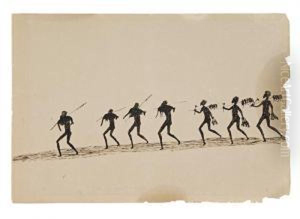 Returning From The Chase by Tommy McRae is a striking example of 19th-century Indigenous Australian art, capturing the dynamic energy of Aboriginal hunting traditions. Painted with ink on cardboard, McRae’s work features delicate, linear figures in motion—hunters and kangaroos intertwined in rhythmic movement across the page. The monochromatic palette and flowing contours reflect his distinctive style, blending traditional Aboriginal storytelling with European visual conventions of the time. As a Kwatkwat artist from the Yorta Yorta community, McRae documented both everyday life and ceremonial scenes, making his work invaluable for understanding colonial-era Indigenous perspectives. The piece stands as a rare surviving record of Aboriginal artistry from this period, bridging cultural expression and historical narrative. Today, it is celebrated not only for its aesthetic grace but also for its role in preserving Indigenous heritage in a rapidly changing Australia.
