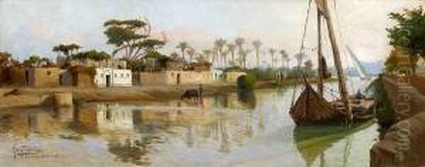 The luminous watercolor Dorf Am Nil by Austrian Orientalist painter Tony Binder (1868–1944) captures a serene riverside village along the Nile with delicate lyricism. Painted during Binder’s extensive travels through North Africa and the Middle East in the early 20th century, the work exemplifies European Orientalism’s romanticized yet ethnographic gaze, blending soft Impressionist brushwork with meticulous architectural details. Bathed in golden afternoon light, the composition depicts traditional mud-brick houses clustered along palm-fringed banks, their reflections shimmering in calm waters—a harmonious dialogue between human habitation and nature. Though less politically charged than his peers like Deutsch or Gerôme, Binder’s works hold historical significance as vivid documents of cross-cultural encounters during colonialism’s twilight. The painting’s atmospheric precision places it within the late Orientalist tradition, bridging academic detail and emerging modernist lightness.