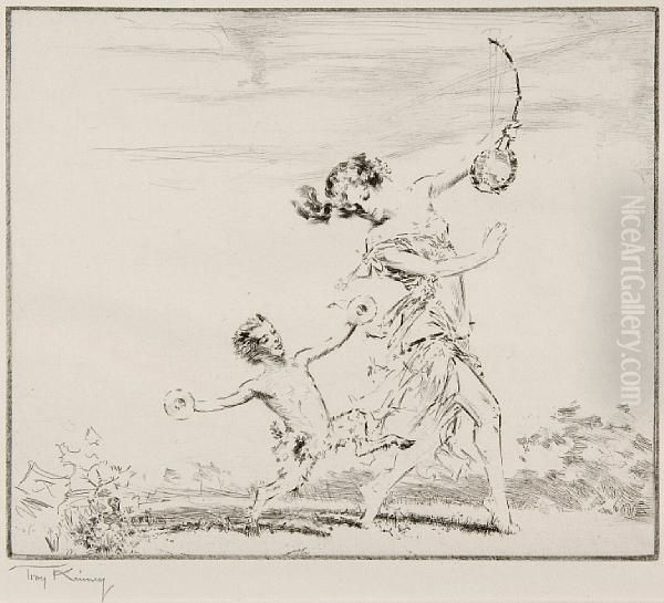 In Girl With Fawn by Troy Kinney, the delicate interplay of innocence and nature unfolds gracefully. Kinney, an early 20th-century American artist renowned for his etchings and depictions of ballet and allegorical scenes, captures a tender moment between a young girl and her fawn companion. The etching-like quality lends a soft yet precise texture, evoking dreamlike nostalgia—characteristic of Kinney’s refined Art Nouveau influences blended with realism. Predominantly tonal, the composition balances light and shadow masterfully, drawing focus to the gentle bond between the figures. Historically, Kinney’s works bridged decorative and fine arts, making Girl With Fawn exemplary of his ability to merge narrative charm with technical finesse. While less known than his dance-themed pieces, this work exemplifies his versatility and contributes to early modernist explorations of human-animal symbiosis.