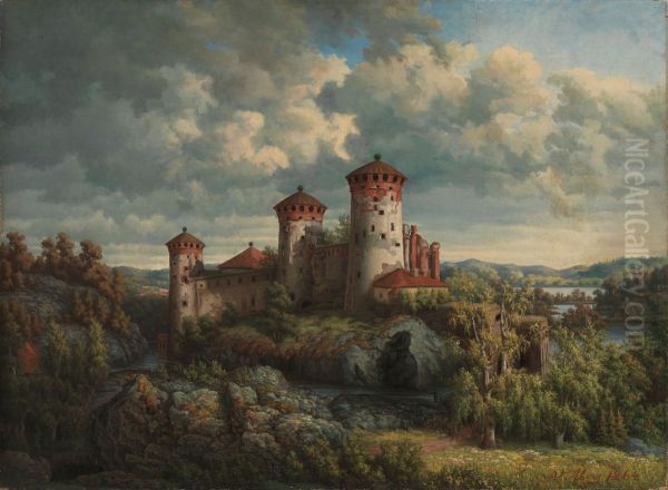 Nakoala Olavinlinnaan by Victoria Åberg (1824–1892) is a serene yet evocative 19th-century Finnish landscape painting that captures the poetic stillness of nature. The work depicts Olavinlinna Castle (a medieval fortress in Savonlinna, Finland) reflected in the calm waters of Lake Saimaa, bathed in soft, diffused light. Åberg, a Romantic-era artist influenced by the Düsseldorf School, renders the scene with meticulous detail and a muted, earthy palette, creating a dreamlike quality that blends realism with emotional atmosphere. As one of Finland’s early female landscape painters, her work holds historical significance in Scandinavian art, bridging Romanticism’s idealism with emerging national identity. The painting’s quiet grandeur and harmonious composition reflect the era’s reverence for untamed landscapes, while its subtle tonal shifts demonstrate Åberg’s mastery of light—a hallmark of her oeuvre.