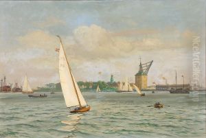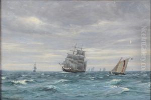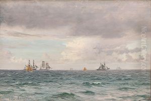 Seascape with sailing ships and boats off the coast of Gilleleje, Denmark.