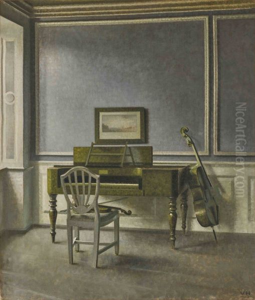 Vilhelm Hammershøi's "Interior. The Music Room, Strandgade 30" (1901) captivates with its enigmatic stillness—a masterclass in Scandinavian minimalism. The Danish painter transforms his Copenhagen home into a meditation on light and absence, where muted sunlight filters through bare windows onto an unadorned piano, its silent keys echoing through empty space. Characteristic of Hammershøi's signature "poetry of silence," the composition employs a restrained palette of greys, ivories and pale ochres, dissolving architectural details into atmospheric brushstrokes—a radical departure from 19th-century narrative painting. This work exemplifies the artist's pivotal role in bridging Symbolism and Modernism, influencing later Minimalist movements. Art historians note its anticipation of Edward Hopper's architectural emptiness and even Gerhard Richter's blurred realism, securing Hammershøi's position as a quiet revolutionary in European interior scene painting.
