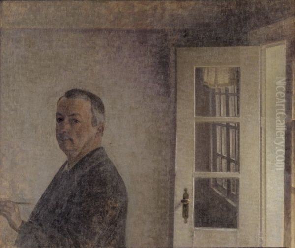 Vilhelm Hammershøi's Self-Portrait. The Cottage Spurveskjul at Sorgenfri, North of Copenhagen (1907) is a mesmerizing example of the Danish artist's signature poetic restraint. The painting depicts the artist standing in a modest wooden cottage bathed in soft, diffused light, his figure partially obscured by shadow, creating an enigmatic yet intimate atmosphere. Hammershøi, renowned for his muted color palettes and masterful treatment of light, employs delicate grays, creams, and subtle blues to evoke quiet contemplation. The cottage, set against the tranquil landscape of Sorgenfri, becomes both a physical and psychological space, reflecting the artist's introspective nature. As a key figure in Nordic Symbolism, Hammershøi's work diverged from the vibrant realism of his contemporaries, instead embracing minimalism and emotional ambiguity—an approach that later influenced modernist painters. This piece encapsulates his lifelong fascination with solitude and subdued interiors, cementing his position as one of Denmark's most introspective artists.