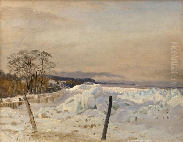 Vilhelm Kyhn’s Isskruninger ved Tarbaek (1863) captures the serene yet dynamic beauty of winter along Denmark’s coast. This oil painting showcases Kyhn’s mastery in rendering natural light and textures: sunlight dances on the icy fjord, contrasting with the dark, windswept trees and the soft snowfall. As a leading figure of the Danish Golden Age, Kyhn bridged Romanticism’s emotional depth with emerging realism, emphasizing meticulous detail—seen here in the crisp ice fractals and delicate cloudscape. The work reflects his lifelong dedication to landscapes, offering a poetic yet authentic Nordic winter, distinct from the era’s more dramatic Scandinavian works. Historically, it underscores Denmark’s 19th-century artistic focus on national identity through nature, positioning Kyhn alongside contemporaries like Christen Købke.