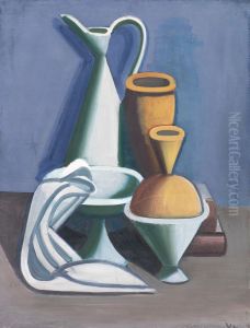 Opstilling Med Lerkrukke, Hvid Serviet, To Hvide Kander Og Liggende Vase Med Kegleformet Overdel