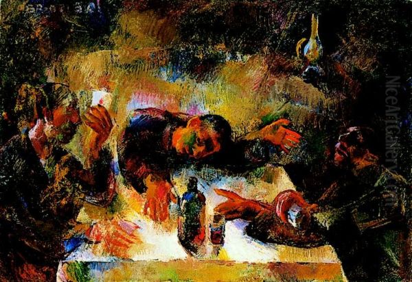 Vilmos Aba-Novák’s Drinkers (Wine Drinkers) (1930) is a vivid, emotionally charged portrayal of camaraderie and revelry, capturing the boisterous energy of a group of men gathered around a table in a rustic tavern. The painting exudes raw vitality, with bold, expressive brushstrokes and a dynamic composition that echoes the influence of German Expressionism and Hungarian avant-garde movements. Aba-Novák, a leading figure in 20th-century Hungarian art, masterfully blends folkloric themes with modernist techniques, creating a work that feels both timeless and deeply rooted in its cultural context. The skewed perspective and exaggerated forms heighten the sense of movement and intoxication, while the warm, earthy tones evoke the conviviality of shared wine and laughter. As part of the Nyolcak (The Eight) group, Aba-Novák’s work represents a bridge between traditional Hungarian art and European modernism, cementing Drinkers as a significant piece in Central European art history.
