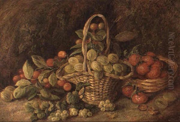 A Basket Of Gooseberries And A Basket Of Mixed Fruit On A Mossy Bank