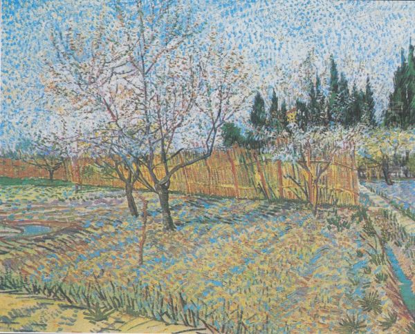 Vincent van Gogh's Flowering Orchard with Peach Trees (1888) bursts with the radiant energy of spring, capturing a Provençal orchard in full bloom under a vivid blue sky. Painted during his transformative Arles period, this work reflects van Gogh’s fascination with Japanese prints—evident in the flattened perspective and bold outlines—while infusing his signature Post-Impressionist style through tactile brushstrokes and pulsating color contrasts. The delicate pink blossoms quiver against the turquoise sky, embodying his belief in color as an emotional force. Historically, this orchard series marks his optimistic experimentation with light and renewal, predating his later turbulence. Though lesser-known than Sunflowers or Starry Night, it exemplifies his ability to find ecstasy in nature’s ephemeral beauty.