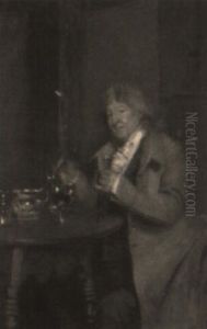 Walter Dendy Sadler’s A Glass of Toddy captures the cozy, convivial spirit of Victorian domestic life with warmth and meticulous detail. Painted in the late 19th century, the work exemplifies Sadler’s signature genre scenes, characterized by their narrative richness, soft lighting, and affectionate portrayal of everyday moments. The painting depicts a gentleman in a plush armchair enjoying a steaming glass of toddy (a traditional warming drink), surrounded by richly textured fabrics and the glow of a fireplace—a scene that radiates comfort and quiet indulgence. Belonging to the tradition of British narrative painting, Sadler’s work often drew comparisons to earlier genre painters like David Wilkie, though his style retains a distinctly Victorian sentimental charm. While not as radical as his avant-garde contemporaries, Sadler’s works are prized for their historical authenticity and ability to evoke nostalgia, making A Glass of Toddy a charming artifact of its era.