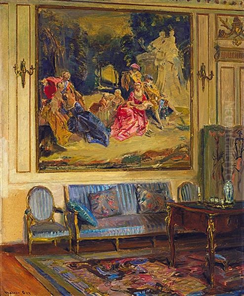 In Walter Gay's Boudoir, Chateau de Chaalis, the artist masterfully captures an intimate and refined 18th-century interior bathed in soft, diffused light. The delicate Rococo furnishings—elaborately carved chairs, a giltwood mirror, and floral textiles—create an atmosphere of aristocratic elegance frozen in time. Painted during Gay's mature period in France (early 20th century), this work exemplifies his specialization in tableaux de style—empty yet psychologically charged rooms that reinvent historical décors with Pre-Raphaelite precision. Unlike his contemporaries' grand historical scenes, Gay's focus on quiet interiors bridged academic traditions and emerging modernist interests in domestic spaces. Today, the painting is celebrated as a key example of intimisme, offering a window into French taste preservation during the Belle Époque while foreshadowing the narrative potential of vacant rooms later explored by Hopper.