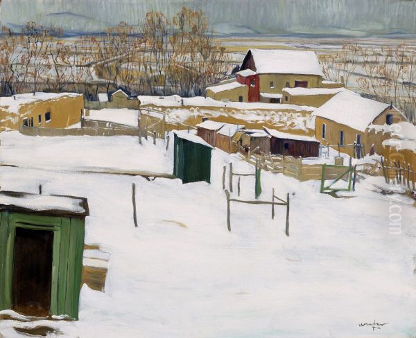 Walter Ufer's Taos in the Snow is a captivating portrayal of the quiet majesty of winter in the American Southwest. The painting depicts a snow-dusted Taos Pueblo village, rendered in Ufer’s signature realist-impressionist style, blending precise detail with expressive brushwork to evoke both the crisp chill of the air and the serene beauty of the scene. Completed in the early 20th century during Ufer’s time in the Taos Society of Artists, it reflects his deep connection to Indigenous cultures and the rugged New Mexico landscape. Its subdued yet luminous palette—soft blues, warm earthen tones, and delicate whites—creates a harmonious balance, while the composition draws the viewer into the quiet rhythm of daily life. As a key work in American regionalism, Taos in the Snow bridges the gap between traditional realism and modern expressiveness, offering a poignant glimpse into a vanishing way of life. Today, it remains an important piece in discussions of early 20th-century American art and the Taos art colony’s legacy.