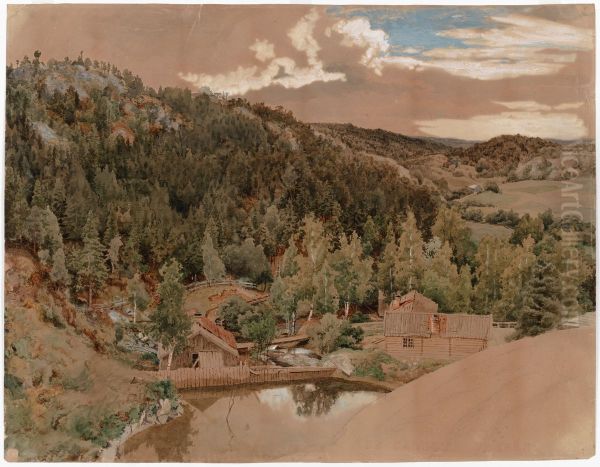 Werner Holmberg's Myllypato (1859–1860) is a captivating example of Finnish Romantic landscape painting, embodying the era’s fascination with nature’s sublime beauty. The artwork depicts a serene mill dam enveloped in lush greenery, with dappled light filtering through the trees and reflecting on the water’s surface. Holmberg, a pioneer of Finnish national landscape art, masterfully blends meticulous detail with atmospheric mood—soft brushstrokes convey the play of light, while the composition balances tranquility and subtle dynamism. Historically significant, Myllypato reflects the 19th-century Nordic shift toward landscapes as vehicles for national identity and emotional depth, positioning Holmberg alongside luminaries like Fanny Churberg. Its poetic realism bridges Romanticism and emerging naturalism, making it a treasured piece in Finland’s artistic heritage.