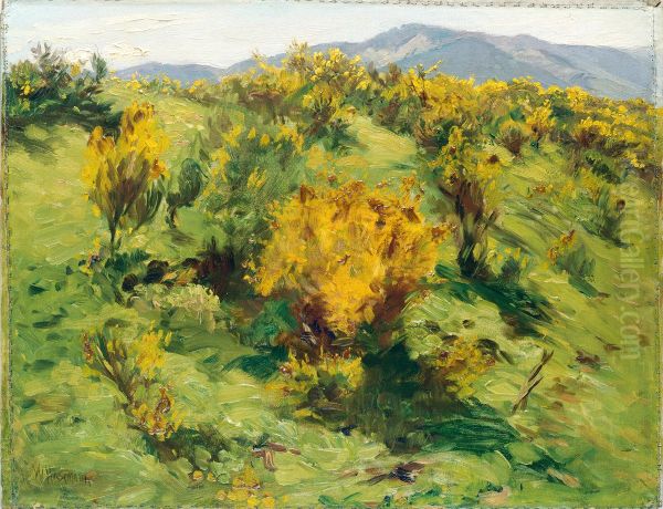 Wilhelm Hasemann’s Blooming Gorse captures the radiant beauty of nature with remarkable warmth and vitality. Set against the idyllic landscapes of Germany’s Black Forest region—Hasemann’s lifelong muse—the painting immerses viewers in a sea of golden gorse blossoms, their vivid yellow hues contrasting with lush greenery and soft, dappled sunlight. Executed in the late 19th or early 20th century, the work exemplifies the artist’s signature Naturalist style, blending meticulous detail with an emotive, almost poetic reverence for rural life. Though less globally prominent than his contemporaries in the Impressionist movement, Hasemann holds a significant place in German regional art, celebrated for his ability to elevate everyday scenes into timeless celebrations of light and color. Blooming Gorse reflects this legacy, embodying both technical precision and an infectious joie de vivre.