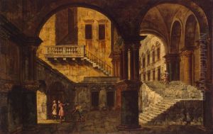 Wilhelm Marstrand's An Italian Courtyard With a Stair is a captivating 19th-century oil painting that exudes the romance and warmth of Mediterranean life. The scene depicts a sun-drenched Italian courtyard, where arched doorways, worn stone steps, and lush greenery create an inviting atmosphere. Marstrand, a Danish artist influenced by the Golden Age of Danish painting and Italian travels, masterfully blends naturalism with a touch of idealized charm, reflecting the era's fascination with Southern European culture. The play of light and shadow, along with the carefully rendered textures of stone and foliage, showcases his technical skill. This work represents Marstrand's transition between portraiture and narrative scenes, offering a glimpse into his lesser-known architectural studies. It holds significance in 19th-century Nordic art as a bridge between Danish traditions and Mediterranean influences, capturing the allure that drew Northern European artists to Italy.