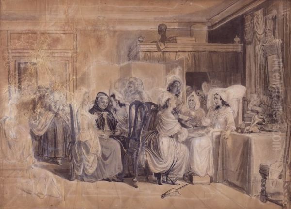 Wilhelm Marstrand’s Karton til "Barselstuen" (Cartoon for "The Maternity Room") is a captivating 19th-century Danish genre painting that exudes warmth and intimacy. Created as a preparatory sketch for a larger work, it depicts a cozy domestic scene—likely a mother and child surrounded by family—with Marstrand’s signature narrative charm. His style blends Romantic sentimentality with keen observational detail, reflecting the Golden Age of Danish art’s focus on everyday life infused with emotional depth. The soft lighting and tender interactions evoke a sense of quiet celebration, characteristic of Marstrand’s ability to transform ordinary moments into poetic vignettes. This work holds significance for its insight into 19th-century bourgeois ideals and Marstrand’s role as a storyteller through brushstrokes, bridging realism and idealism.