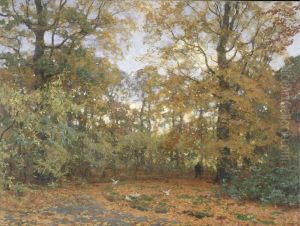 Najaar: A Forest Clearing With Crows On A Wooden Bench