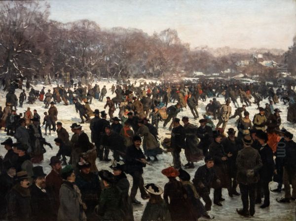 Willem Bastiaan Tholen’s Schlittschuhlaufen (Teich im Haagse Bos) (Skating on the Pond in Haagse Bos) is a captivating late 19th-century Dutch winter scene that radiates tranquility and communal joy. Painted in the Hague School tradition, Tholen masterfully captures the soft, diffused light of a frosty afternoon, where skaters glide gracefully across the frozen pond, their reflections shimmering in the icy surface. The muted palette of blues, grays, and earthy tones evokes a serene, almost nostalgic atmosphere, while loose, expressive brushstrokes lend the scene vitality. Tholen, though less renowned than his contemporaries like Jozef Israëls, was a significant figure in Dutch realism, celebrated for his ability to blend naturalism with subtle emotional resonance. This work exemplifies the Hague School’s focus on everyday life and the Dutch landscape, offering a poetic yet unromanticized glimpse into 19th-century leisure.