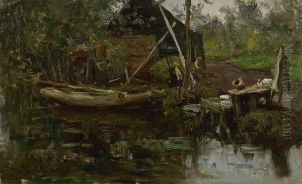 Willem Roelofs’ Bij de boerderij, Noorden (1855-60) is a captivating example of Dutch Romantic landscape painting, imbued with serene naturalism and atmospheric depth. Set near the village of Noorden in the Netherlands, the work depicts a tranquil rural scene—a thatched farmhouse nestled among trees, reflected in still water, under a vast, cloud-dappled sky. Roelofs’ masterful handling of light and texture—soft foliage, shimmering water, and delicate sky—bridges the detailed realism of the Hague School with the poetic lyricism of French Barbizon influences. As a pioneer of Dutch plein-air painting, he paved the way for later movements like Impressionism, making this work historically significant for its loose brushwork and emphasis on mood over topographical precision. The painting’s quiet harmony embodies 19th-century Europe’s idealized view of agrarian life, positioning Roelofs as a vital transitional figure in landscape art.