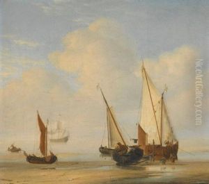 A Smalschip With Sail Set At Anchor Close To The Shore And A Boeier Laid Ashore