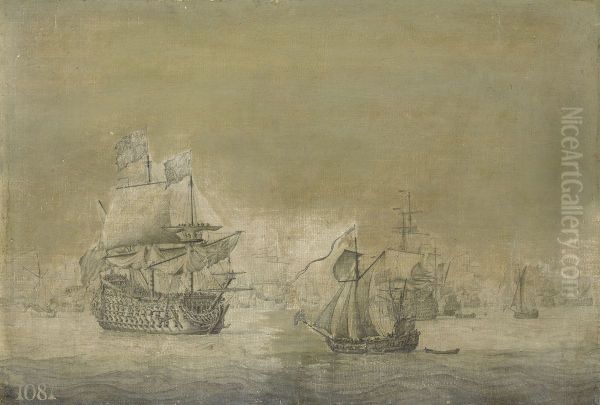 For interior spaces, this painting would exude timeless sophistication in a study, boardroom, or coastal-inspired living area. Its ideal placement would be above a fireplace or along a neutral-toned wall, where the soft blues and warm wood hues of the ships can harmonize with natural materials like oak furniture or linen textiles. A frame with a subtle gilt or weathered finish would complement its classical charm without overpowering the artwork. Given its likely medium-to-large scale (typical of van de Velde’s oils), it demands ample wall space to allow viewers to appreciate the intricate rigging and reflected light. Pair it with nautical accents—such as brass telescopes or subdued blue-and-white ceramics—to create a cohesive theme, while avoiding clutter to let the painting’s serene grandeur take center stage. In an office, it would convey authority and tradition, suited to professions tied to maritime history, navigation, or heritage.