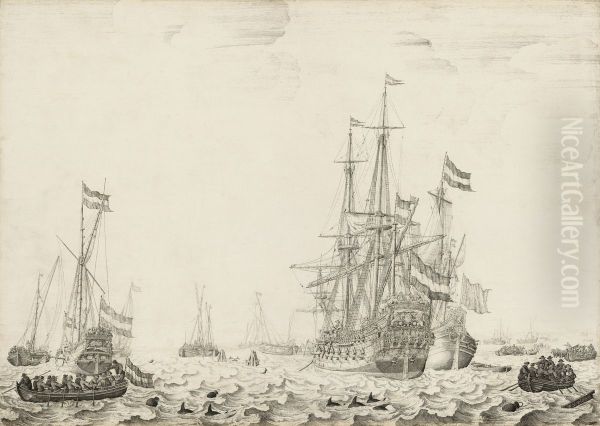 The painting Dutch Ships near the Coast by Willem van de Velde the Elder is a masterful depiction of 17th-century maritime life, capturing the dynamic energy of Dutch naval power during the Golden Age. Van de Velde, renowned for his precision and attention to detail, portrays ships with remarkable accuracy—their billowing sails, intricate rigging, and the play of light on the choppy waters evoke a sense of motion and grandeur. The muted yet luminous palette of blues, grays, and earthy tones enhances the realism, while the expansive sky and distant coastline add depth and atmosphere. As one of the foremost marine painters of his time, van de Velde's works are celebrated for their historical and technical significance, offering a window into Holland's seafaring dominance. This piece exemplifies his skill in balancing documentary precision with artistic elegance, cementing his legacy in Dutch Baroque art.