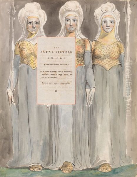 William Blake’s The Poems of Thomas Gray, Design 67, "The Fatal Sisters" is a hauntingly evocative illustration that captures the eerie and supernatural essence of Gray’s poetic narrative. The artwork, created around 1797–1798 as part of Blake’s series of illustrations for Thomas Gray’s poems, depicts the Norse mythological figures known as the Valkyries, who weave the fate of warriors on a ghostly loom. Blake’s distinctive romantic and visionary style is evident in the fluid, almost ethereal lines and the dramatic interplay of light and shadow, which heighten the sense of otherworldly doom. This piece exemplifies his mastery of blending literary inspiration with visual symbolism, marking it as a significant work within his oeuvre and the broader Romantic movement. Its historical and artistic importance lies in its fusion of Gothic sensibility with Blake’s unique mystical imagination, offering a window into the 18th-century fascination with medievalism and the sublime.
