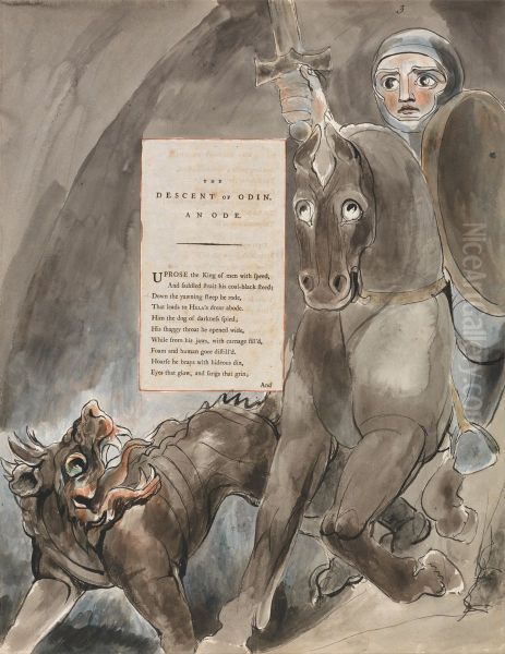 William Blake's visionary illustration The Poems of Thomas Gray, Design 79, "The Descent of Odin" embodies his signature fusion of Gothic mysticism and Romantic intensity. This striking watercolor, created around 1797–1798 as part of Blake’s commissioned illustrations for Thomas Gray’s poems, depicts Odin’s spectral journey to the underworld with electrifying drama. The composition swirls with motion: Odin’s gaunt figure descends amidst jagged, flame-like forms, while ghostly figures emerge from inky shadows, rendered in Blake’s distinctive linear style. The palette of murky browns, eerie blues, and fiery accents amplifies the supernatural tension, reflecting Blake’s fascination with Norse mythology and the sublime. Historically, this work exemplifies Blake’s revolutionary rejection of academic conventions, favoring emotional depth and symbolic complexity. Its mythic subject and expressionistic execution place it as a precursor to Symbolist and even Expressionist movements, cementing Blake’s legacy as a proto-modernist master.