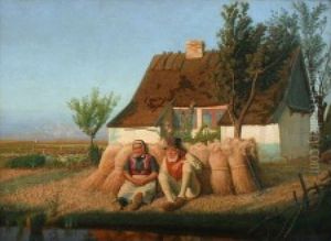 "Harvest Time 2" by William Joseph Shayer radiates with the golden warmth of rural England during the early Victorian era. This oil painting from the mid-19th century captures the romanticized essence of countryside life, depicting laborers gathering wheat under soft afternoon light. Shayer's characteristic genre scene combines meticulous detail with atmospheric richness, showcasing his masterful renderings of rustic textures—from weathered hats to sun-dried grain stalks. As a leading figure among English rustic painters (1811-1892), Shayer bridged the Romantic tradition with emerging Victorian realism. The composition balances human activity with pastoral tranquility, positioning it stylistically between Constable's landscapes and Frith's narrative scenes. Held in numerous museum collections, these harvest scenes represent England's agricultural heritage during industrialization, providing documentary value alongside artistic merit through their authentic portrayal of rural costumes and implements.