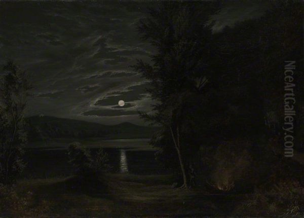 For interior decoration, Moonlight and Campfire would elegantly enhance a study, lounge, or office aiming for a refined yet cozy ambiance. Its ideal placement would be above a fireplace or a console table, where its warm and cool contrasts harmonize with neutral or earthy color schemes. A gilded or dark wooden frame would accentuate its classical charm. Given its likely medium size (typical of 19th-century academic works), it suits intimate spaces like reading nooks or executive offices rather than expansive walls. Pair it with subdued lighting—dimmed lamps or candles—to amplify its luminescent quality, and complement it with textured furnishings like leather armchairs or wool throws to echo its rustic yet sophisticated tone. This painting thrives in settings where its quiet drama inspires reflection and warmth.