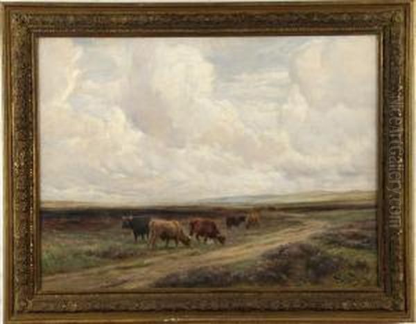 Wright Barker’s Highland Cattle In A Meadow is a serene yet evocative pastoral scene that captures the untamed beauty of the Scottish Highlands with remarkable realism. The painting depicts a small herd of Highland cattle grazing peacefully in a sun-dappled meadow, their shaggy coats and curved horns rendered in meticulous detail against a backdrop of rolling hills and soft, golden light. Barker, a British artist active in the late 19th and early 20th centuries, was renowned for his animal portraits and rural landscapes, blending academic precision with a subtle romanticism. The work exemplifies the Victorian-era fascination with rural life and nature’s grandeur, offering a tranquil counterpoint to the industrial upheaval of the time. Though not as widely recognized as some of his contemporaries, Barker’s technical mastery and emotive compositions have earned him a respected place in British naturalist painting, with this piece embodying the quiet dignity of agrarian subjects.