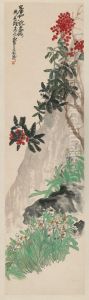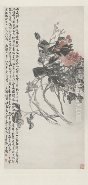 Wu Changshuo's Wu Jun Qing Mu Dan Zhou is a masterful ink painting that exudes timeless elegance, blending vigorous brushwork with poetic subtlety. Painted during the late Qing Dynasty—when Wu was a leading figure in the Shanghai School—this work showcases his signature "stone drum" calligraphic strokes, where the peony's lush petals appear almost sculpted by thick, rhythmic ink lines. The composition balances dynamic energy with classical restraint, typical of Wu's fusion of literati refinement and popular aesthetics. Historically significant, it represents a bridge between traditional Chinese flower-and-bird painting and modern expressive ink art, influencing generations of artists like Qi Baishi. The peony, a symbol of prosperity, is rendered with tactile vitality, its blooms emerging from mist-like washes as if bathed in morning dew.