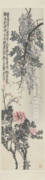 The painting Wu Jun Qing Zi Teng Mu Dan Zhou by Wu Chang-shuo (1844–1927) radiates a vibrant yet refined energy, characteristic of his mature style. A master of the Shanghai School during the late Qing Dynasty, Wu infused traditional Chinese ink painting with bold, expressive brushwork and a dynamic composition. This particular work likely depicts peonies entwined with wisteria, symbolizing prosperity and elegance—a favored subject reflecting his literati sensibilities. The fluidity of his calligraphic lines and the rich, layered ink tones showcase his unparalleled ability to balance spontaneity with meticulous control. Wu’s innovative approach revitalized traditional flower-and-bird painting, earning him a pivotal place in modern Chinese art history as a bridge between classical techniques and modern expressiveness. His works remain highly coveted for their artistic virtuosity and cultural resonance.