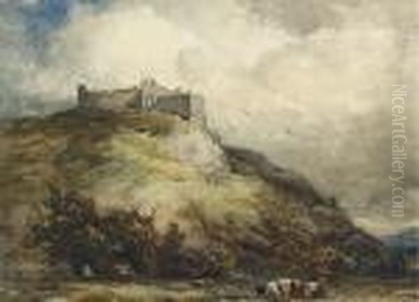 Cattle Grazing Below A Ruined Castle On A Stormy Day