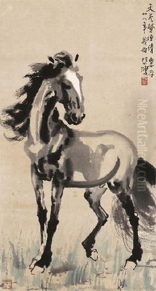 Xu Beihong’s Standing Horse captures the noble spirit and raw energy of the steed with masterful strokes that blend Eastern ink-wash traditions with Western realism. Painted during the 1940s, a tumultuous period in China’s history, the artwork symbolizes resilience and dignity—qualities Beihong often associated with his homeland. The horse stands tall, its muscular form rendered in dynamic yet controlled brushwork, embodying both strength and grace. As one of China’s most celebrated modern artists, Beihong revolutionized traditional ink painting by incorporating chiaroscuro and anatomical precision, bridging cultural divides. Standing Horse remains iconic not only for its artistic brilliance but also as a representation of national pride during challenging times, securing its place as a cornerstone in 20th-century Chinese art.