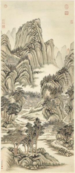 The painting A Journey on Horseback in the Spring Mountains by Yongrong, a renowned Qing Dynasty artist and younger brother of Prince Guo, embodies the refined elegance of imperial court painting traditions. Bathed in soft, misty hues of jade green and pale ink washes, the scroll unfurls a poetic narrative of a scholar’s spring excursion through undulating peaks. Delicate brushstrokes capture the rhythmic movement of hoofbeats along winding mountain paths, while strategically placed voids in the composition echo Daoist philosophies of balance. This mid-18th century work represents the apex of lenient brushwork style favored by Manchu nobility, blending Southern School literati sensibilities with subtle imperial grandeur. Art historians particularly value its unique synthesis of Bada Shanren’s spontaneity with meticulous narrative detail – a bridge between Ming scholarly ideals and emerging Qing court aesthetics that influenced later masters like Jin Nong.