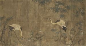 Zou Yigui's Cranes, Bamboo And Lingzhi Fungus By Rocks is a masterful expression of classical Chinese literati painting, blending serene elegance with symbolic depth. The composition features graceful cranes—symbols of longevity—amidst slender bamboo stalks and lingzhi fungi, both representing resilience and immortality, set against weathered rocks that ground the scene in quiet harmony. Rendered in delicate ink washes with subtle color accents, Zou’s meticulous brushwork reflects the refined gongbi (detailed) style, while the restrained composition channels the xieyi (freehand) spirit of Ming-Qing scholarly art. As a court painter during the Qing dynasty, Zou Yigui bridged imperial decorum and scholarly ideals, making this work a significant example of 18th-century Chinese painting that appeals equally to admirers of technical precision and philosophical subtlety. The artwork’s balance of symbolism and naturalism has cemented its status as a cherished piece in the canon of East Asian art history.
